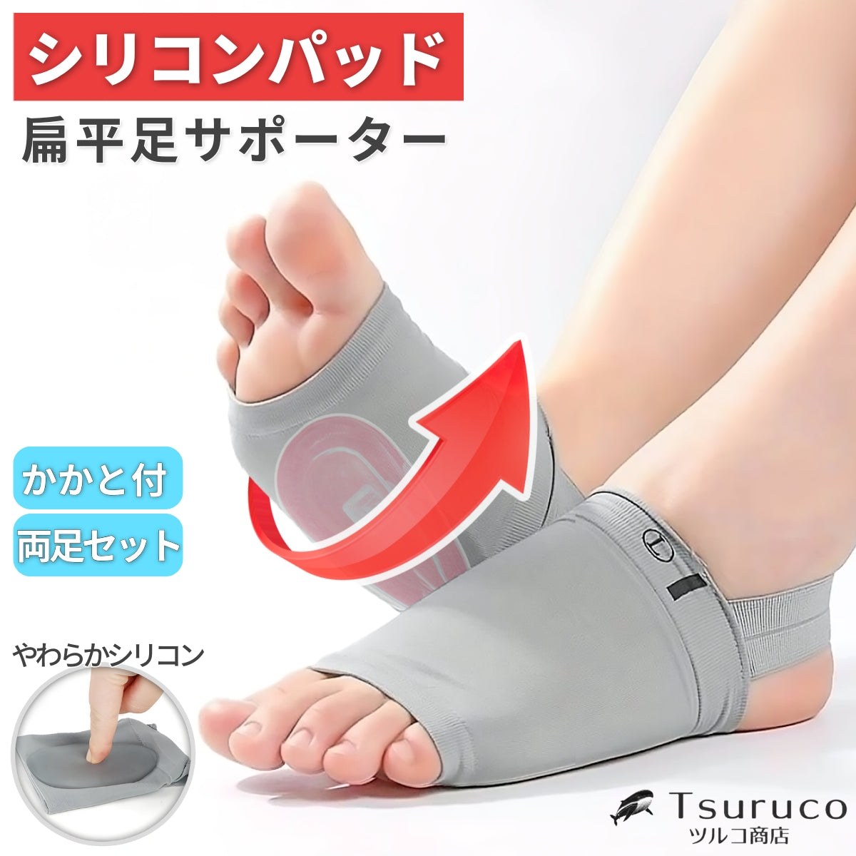 ずれにくく快適!Tsurucoの扁平足サポーターは、土踏まずをしっかり支えるアーチサポート設計。かかとあり・2個セットで両足対応、シリコン素材で柔らかくフィット。足底筋膜炎や偏平足でお悩みの方におすすめです。