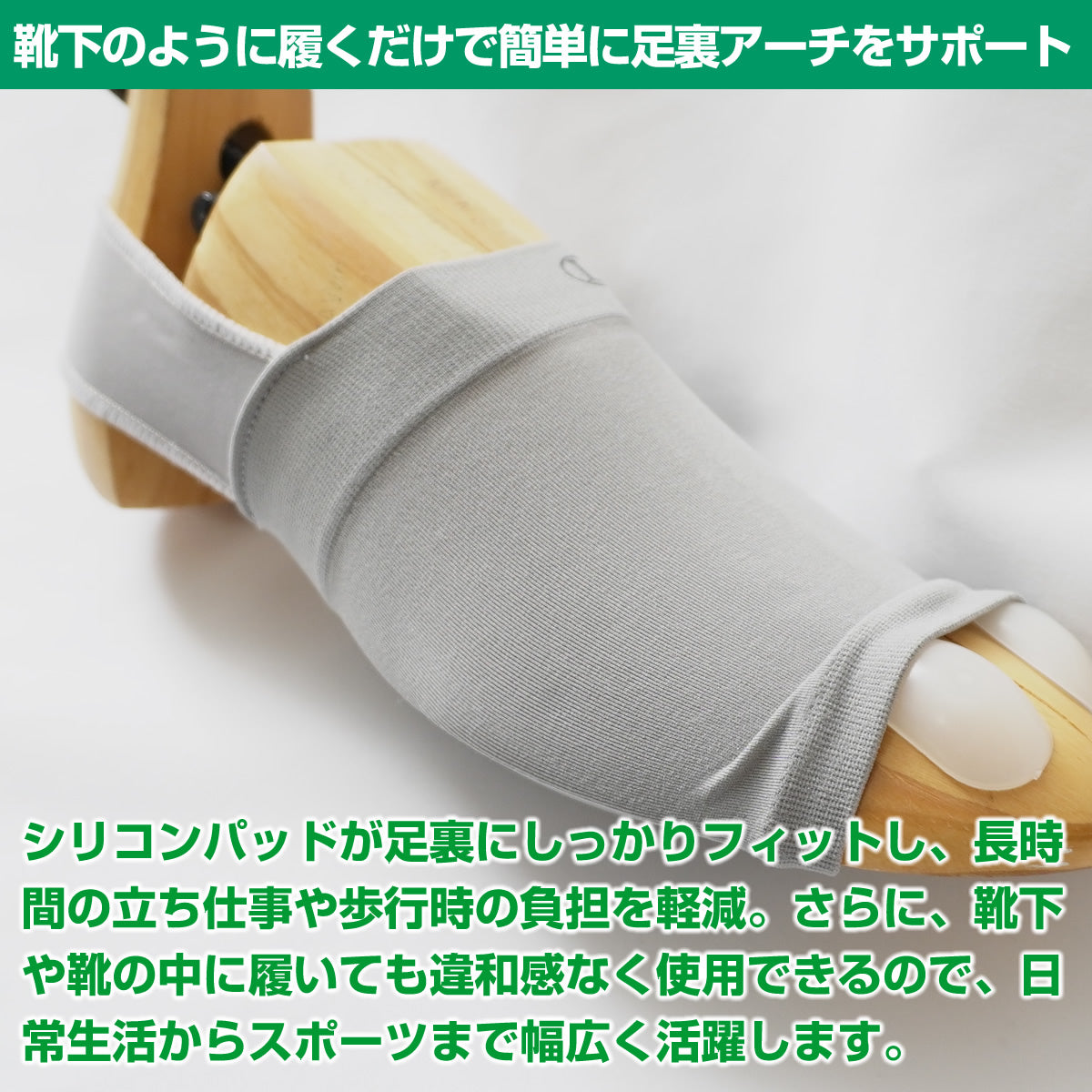 靴下のように履くだけで簡単に足裏アーチをサポート!